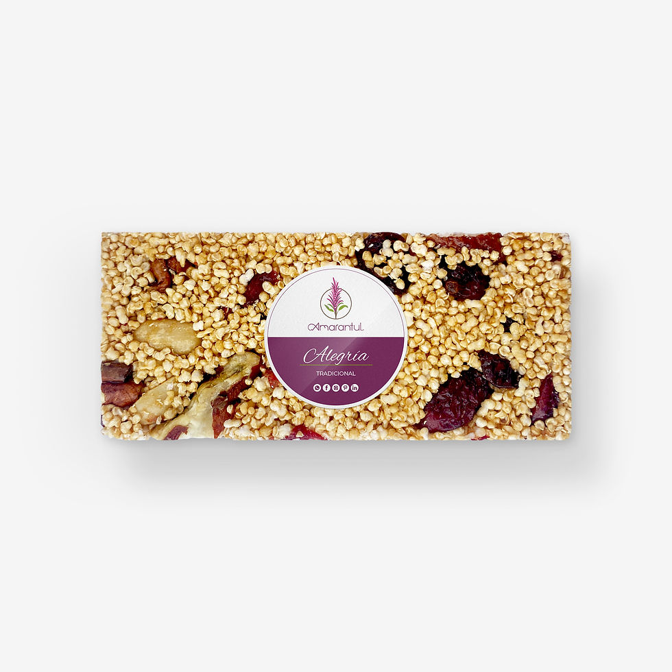 Dulce 100% mexicano elaborado con semillas de amaranto tostadas, miel de piloncillo y miel de abeja, acompañadas de semillas como nuez, almendra, cacahuate, arándano y piñón.